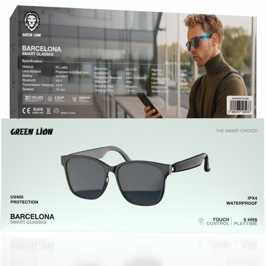 عینک هوشمند Green Lion مدل Barcelona Smart Glasses است — یک گجت پوشیدنی مدرن که طراحی کلاسیک عینک آفتابی را با امکانات بلوتوثی و فناوری صوتی هوشمند ترکیب می‌کند.